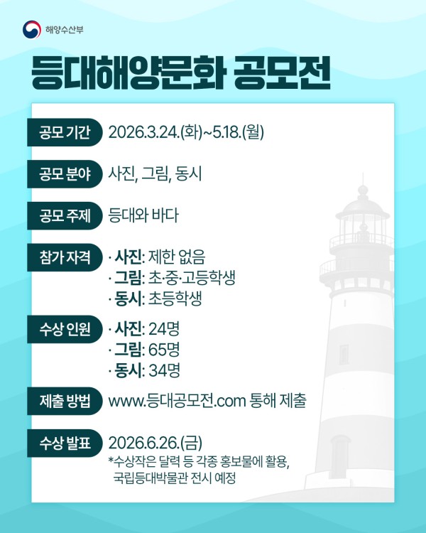 등대해양문화 공모전 페이지 정보 작성자 drone0989 (121.♡.195.155) 댓글 0건 조회 147회 작성일 26-04-21 16:39 목록 본문 등대해양문화 공모전 관련링크 https://cafe.naver.com/droneassociation/3727 5회 연결 이전글2026 길 사진 공모전 26.04.23 다음글2026년 제2회 철도를 담다 영상 공모전 26.04.13 댓글 0 댓글목록 등록된 댓글이 없습니다.
